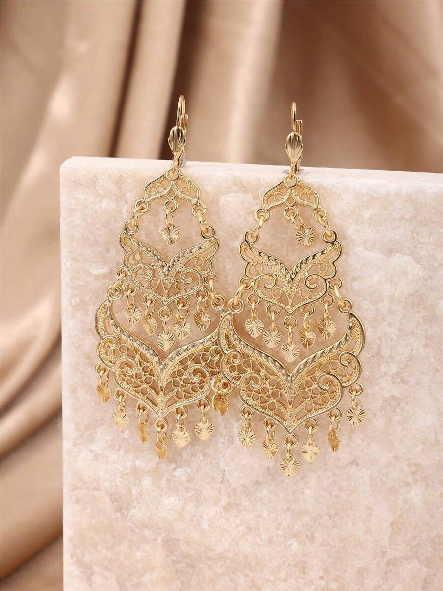 1 par de pendientes de borla hueca elegante de aleación, pendientes largos colgantes de novia marroquí, pendientes de estilo palacio francés vintage, accesorios esenciales para fiestas y festivales de mujeres argelinas