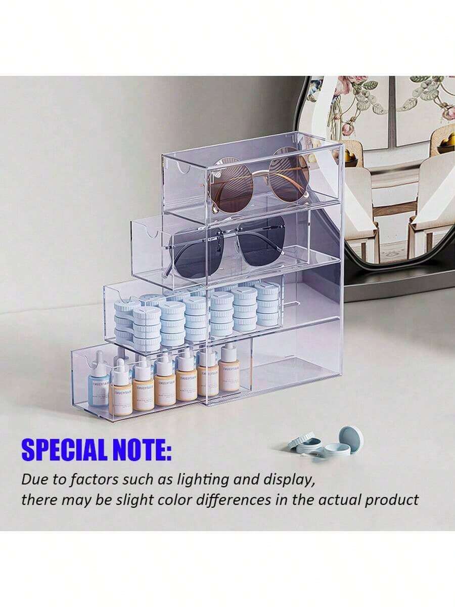 1 pieza Caja de almacenamiento de gafas y gafas de sol de 4 capas y 4 cajones semi-transparentes extraíbles, estuche de exhibición de escritorio apilable de 4 niveles a prueba de polvo, organizador de cajón de papelería