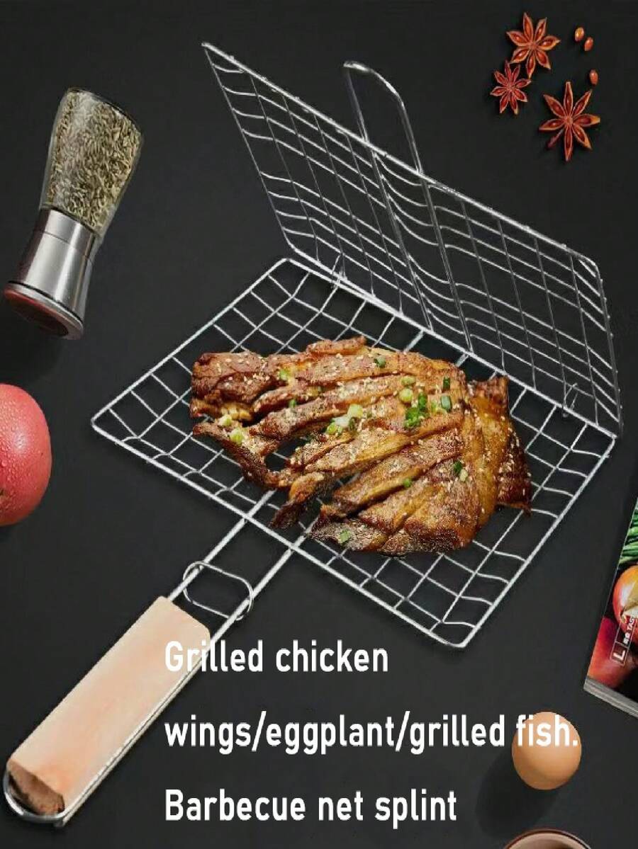 1 pieza Rejilla de acero inoxidable antiadherente multiusos, estilo de camping al aire libre con forma de rejilla desmontable y portátil para parrilla de barbacoa con mango de madera para asar alitas de pollo, berenjena, pescado, perfecta para fiestas de barbacoa de verano, picnics y eventos de parrilla en el patio trasero