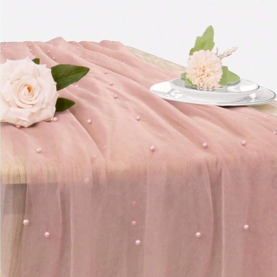 1 pieza Camino de mesa de encaje con perlas romántico, decoración de arco de boda, tela de regalo para despedida de soltera, mantel de encaje con perlas romántico, adecuado para eventos, bordado transparente resistente a las arrugas para mesa de postres
