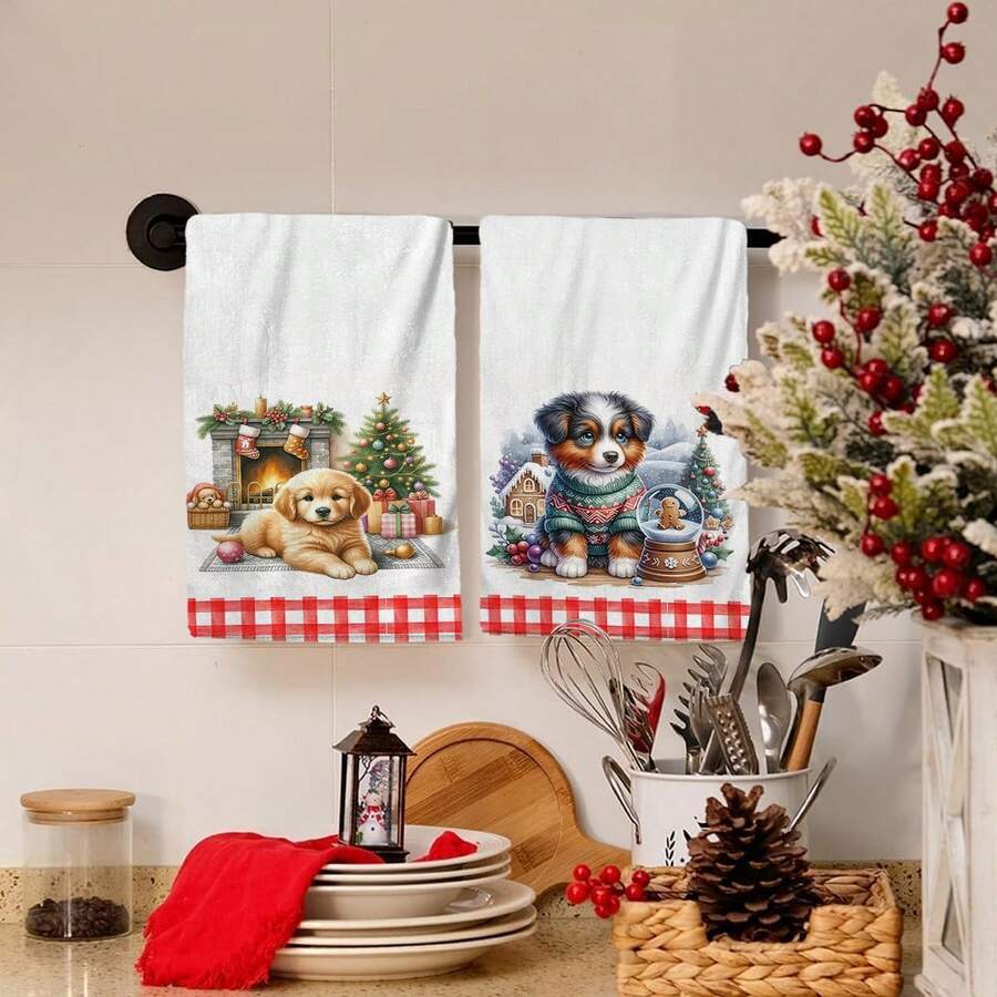 2/4/48 piezas Toallas de cocina navideñas vintage - Toallas de plato y mano ultra suaves y absorbentes de poliéster con diseño de perro lindo y cuadros rojos y blancos a cuadros búfalo - Perfectas para decoración navideña y regalos de Año Nuevo