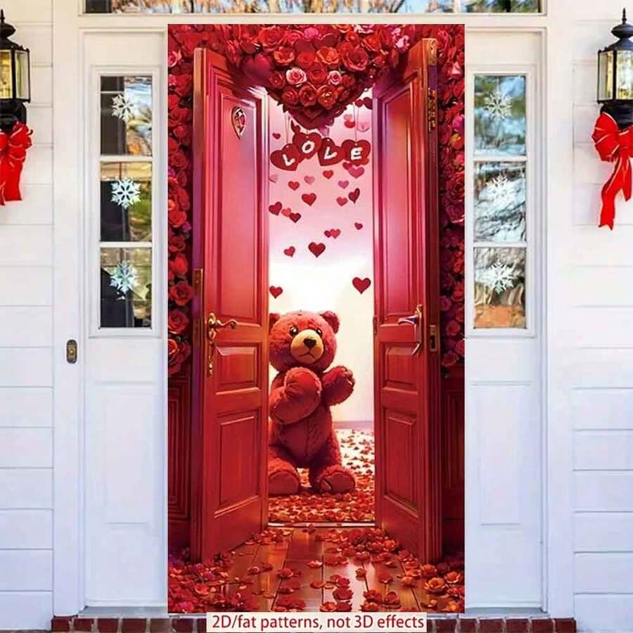 1 pieza Cubierta de puerta plana 2D Oso rojo de San Valentín Banner de rosa de la habitación Cubierta de puerta de poliéster, decoración de habitación, banner colgante de fiesta, decoración navideña, suministros de fiesta, decoración de interiores.