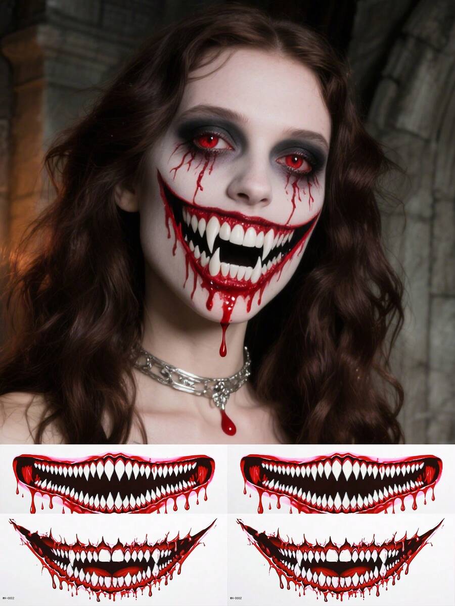 4 hojas de tatuajes temporales de terror de Halloween, tatuajes temporales impermeables, diseño de fauces y dientes densos de monstruos aterradores, de un solo uso, accesorios para festivales, adecuados para accesorios de adultos para maquillaje de fiesta, accesorios para rave
