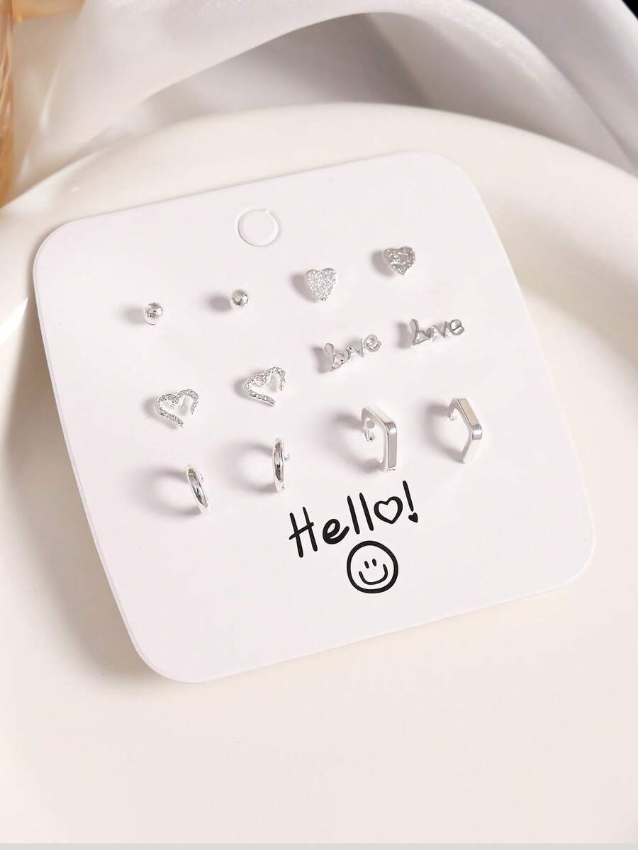 Set de 6 pares de aretes con diseño de corazón y forma de C chapados en plata para mujeres, regalo para mamá o novia