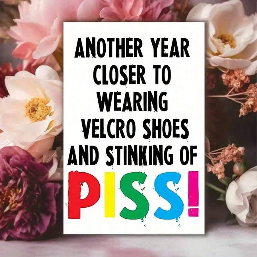 Tarjeta de Navidad con humor audaz "¡OTRO AÑO talla grande CERCA DE USAR ZAPATOS CON Y OLER A ORINA!" Diseño festivo con tipografía de pintura goteante, acentos de bayas de acebo y detalles de purpurina dorada para saludos navideños irreverentes