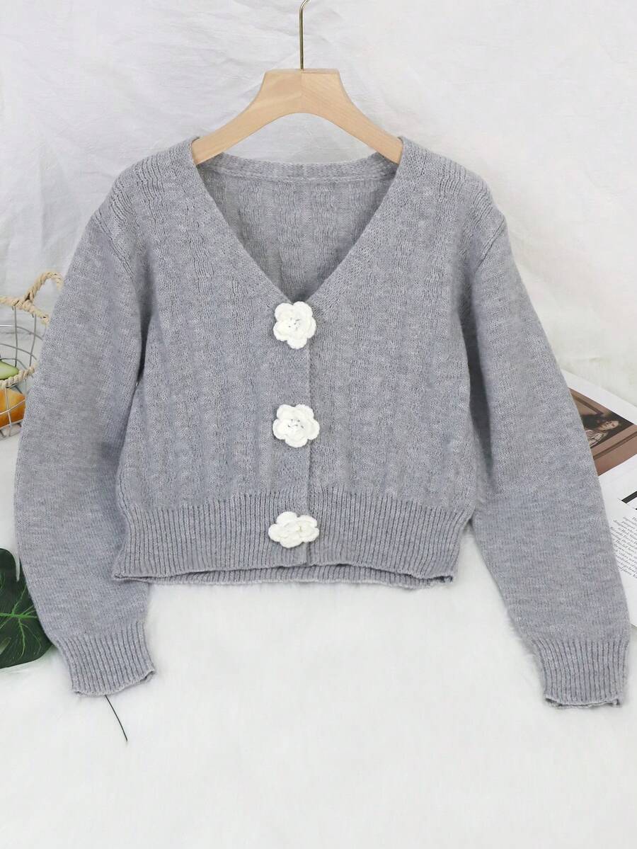Cárdigan con flores, suéter corto de cuello en V de manga larga con botones y tejido grueso, diseño floral 3D, para primavera, Año Nuevo y vacaciones