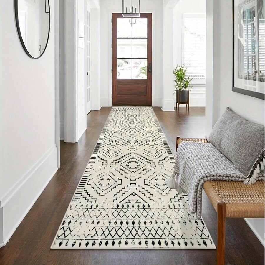 Alfombra pasillo marroquí, alfombra pasillo lavable para cocina, alfombra pasillo geométrica blanca para pasillo y baño, alfombra larga de acento bohemio antideslizante para dormitorio, lavandería, baño, decoración de cocina