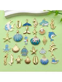 Set de 5 colgantes de acero inoxidable con temática oceánica - estrella de mar, concha, tortuga, tiburón, pez, delfín, caballito de mar. Adecuado para pulsera, collar, tobillera, aretes, joyería DIY, mayoreo, vintage, playa, elementos de fiesta, chapado en oro 18K #1 Más vendidos