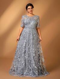 SerinSerin Vestido elegante, romántico y elegante de talla grande con cuello redondo, mangas tres cuartos, bajo en línea A, gris con bordado de lentejuelas, adecuado para cena, despedida de soltera, cita, baile, fiesta, boda, evento de noche, vestido de novia, vestido de madre, vestido de fiesta del Día de San Valentín