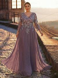 SerinSerin Vestido elegante y lujoso de talla grande con cuello de corazón, manga larga, diseño de aplicaciones, dobladillo extra ancho, bordado de lentejuelas en gris-púrpura, adecuado para fiesta de noche, cita, baile, vacaciones, boda, vestido de madre de la novia