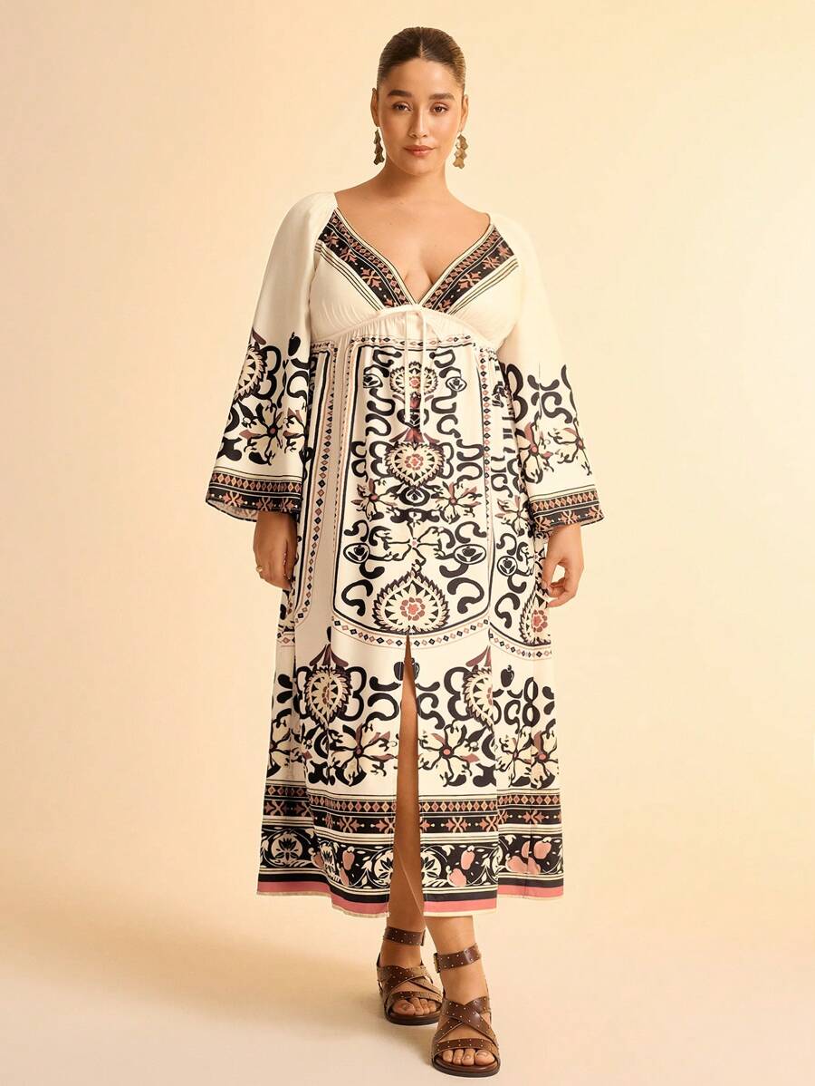 CAJUNI Vestido largo de estilo bohemio con estampado floral, cuello en V, de manga larga y holgado con calado para mujer de talla grande para vacaciones