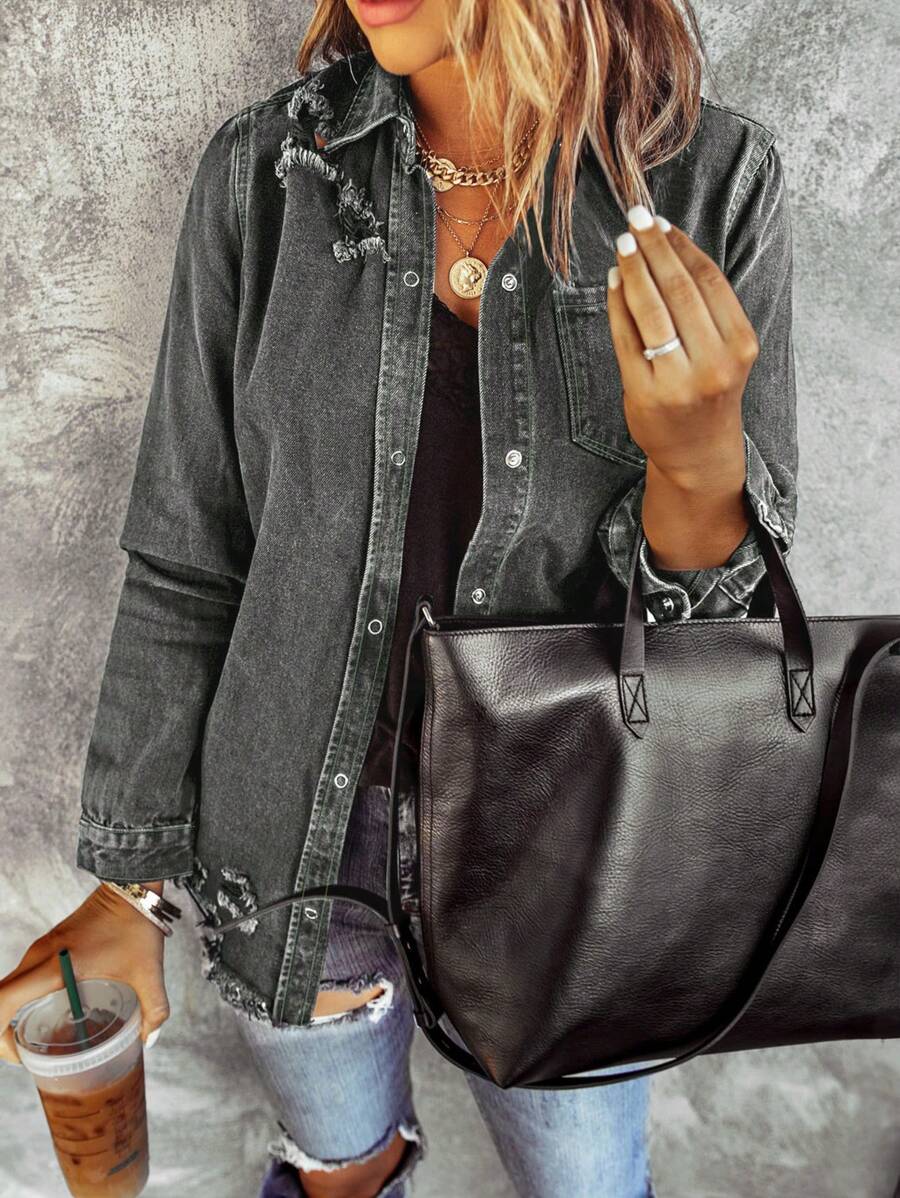 Chaquet De Mezclilla Sólida Con Frente De Botones Y Dobladillo Crudo