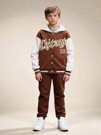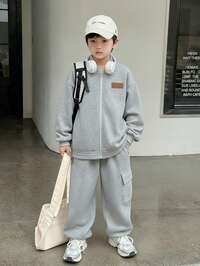 ZikoriSHEIN 2 piezas Conjunto deportivo informal para niño preadolescente: Chaqueta con cuello alto y mangas raglán con cinta decorativa y pantalones con cintura elástica, adecuado para ir y venir, escuela, uso diario casual, viajes, deportes, con forro polar grueso, apto para primavera, verano, otoño, invierno #5 Más vendidos