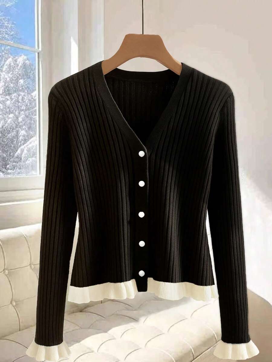 Cárdigan de punto con puños con volantes de color contrastante para mujer, para otoño/invierno, blusas de manga larga de otoño, elegante en color blanco y negro