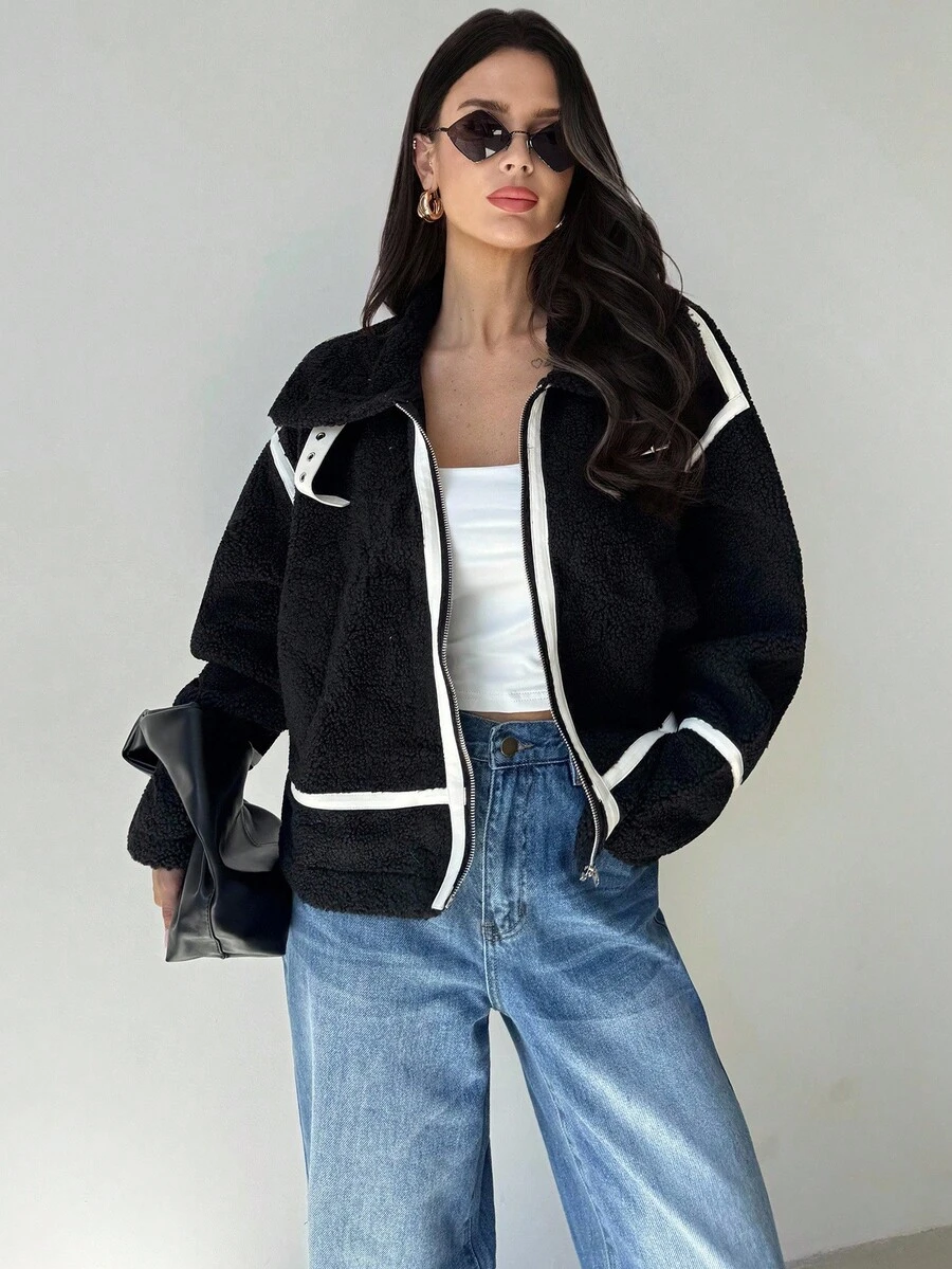 Firerie Abrigo elegante de manga larga con falso pelo y contraste de color para mujer