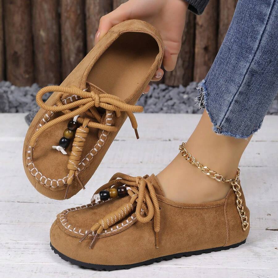 Mocasines planos con flecos para mujer, nuevos de 2025 en unicolor, de ante con cuentas y suela blanda tipo slip-on