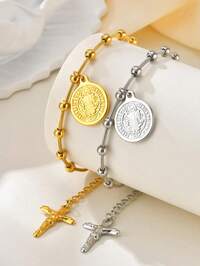 Maija1 pieza Elegante pulsera de acero inoxidable con cuentas, cruz cristiana y colgante de la Virgen María, adecuada para uso diario, fiesta, festival, Día de San Valentín, regalo para amigos, familia, parejas, joyería de moda, accesorios de acero inoxidable #4 Más vendidos