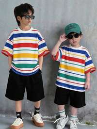 Camiseta de cuello redondo de manga corta con rayas de colores para niños y preadolescentes, top básico, camiseta Y2K, atuendo de verano, adecuado para primavera/verano, salidas, Día de San Valentín, citas, viajes, vacaciones, reuniones familiares, regreso a la escuela, bodas, fiestas, deportes, cumpleaños1 Pieza Camiseta de cuello redondo casual y deportiva para niño, de ajuste holgado, con lavado de agua, suave y cómoda, adecuada para volver al colegio, fiestas de cumpleaños, fiestas, actuaciones, bodas, bautizos, uso diario escolar, viajes, deportes, primavera y verano, estilo japonés y coreano. #2 Más vendidos