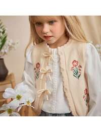 LoomivaLoomiva Cárdigan de punto con botones y flores 3D elegante francés para niña, chaleco de punto sin mangas con estampado floral botánico de cuello redondo, cárdigan floral para niñas, cárdigan de punto para niñas, suéter con lazo para niñas, cárdigan de punto color albaricoque para niñas, cárdigan de punto ligero con bordado floral, casual y lindo adecuado para el hogar, vacaciones, salidas, protección solar, acolchado y forrado térmico, adecuado para el invierno