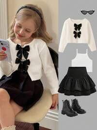 VibeCozSHEIN Cárdigan con lazo para niña con cuello redondo, informal para uso diario, otoño/invierno, tops de manga larga, elegante y lindo, de alta calidad, cálido y suave, versátil para jugar, uso diario, escuela, otoño e invierno, temporada de regreso a clases, estilo universitario