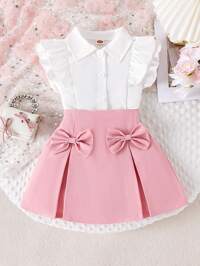 Elladie kidsElladie kids Conjunto de camisa casual para niñas, diseño de lazo en caqui, tela de punto acanalada con cuentas, blusa de manga larga con cuello y volantes en blanco, combinada con pantalones acampanados de perlas en caqui, conjunto de 2 piezas, adecuado para volver al colegio, casual, moda, dulce, cómodo atuendo para viajes al aire libre
